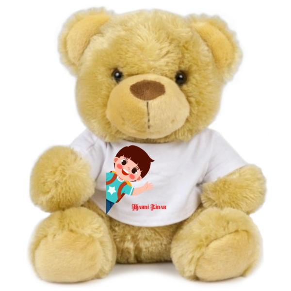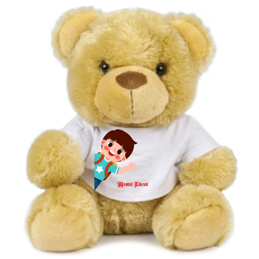 Þessi fallegi bangsi er úr mjúku polyester plushi og er einstaklega hlýlegur og vinalegur. Við prentum bæði mynd og nafn á litla bol bangsans, sem gerir hann að einstakri og persónulegri gjöf fyrir öll tilefni.
